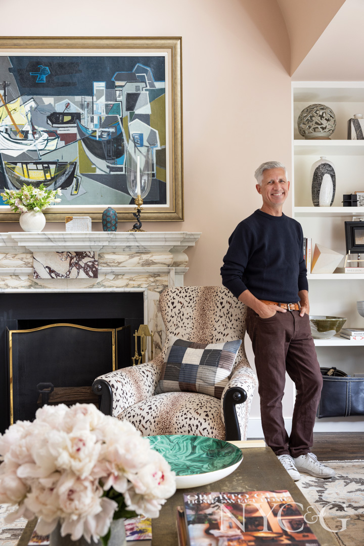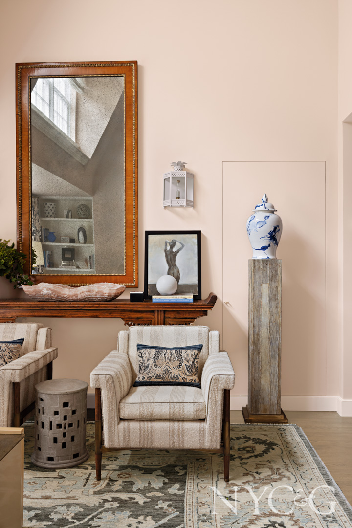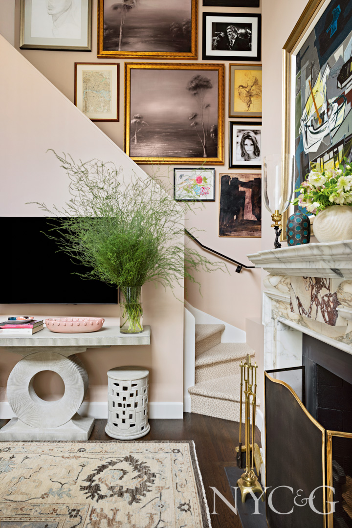From the dining room, the ceilings open up to a double-height, light-filled living room awash in Farrow & Ball’s Setting Plaster—a pale pink that, according to the designer, “is a nice, airy shade that doesn’t shout pink.” A marble mantel sourced from Chesneys serves as a focal point, as does the Danish mid-20th-Century Cubist painting hanging above it. “That painting incorporates all the colors found in the home,” notes Lucas. A mix of textures and patterns in the form of an antique rug, an animal-print wing chair, floral curtains, snakeskin pedestals, and knubby wool fabrics keeps the eye engaged. Meanwhile, a variety of furniture styles—including a modern interpretation of 1950s Italian arm-chairs from Lucas’s showroom, Harbinger—impart a sense that the home has “evolved over time,” says the designer. A gallery wall gracing the staircase to the primary suite adds to this collected appeal. The clients selected some of the pieces on their own, and then Lucas’s team helped round out the mix.