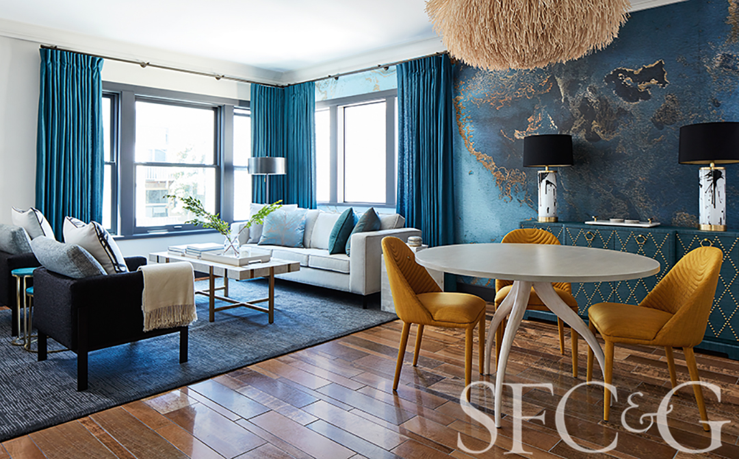 In the dining area, a textural Coup Studios chandelier complements dramatic Area Environments wallpaper. Goldenrod-hued chairs and a Tritter Feefer table are backed by a Bungalow 5 cabinet and a pair of Liz Marsh Design lamps.