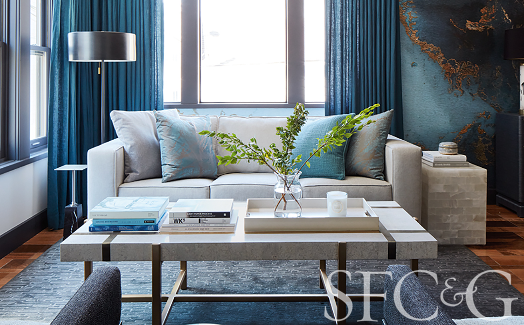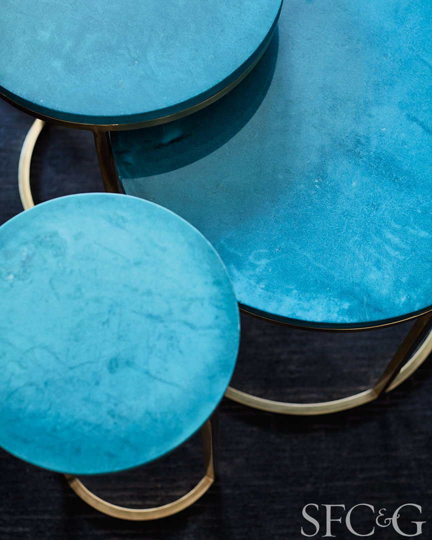 Blue side tables are from Chelsea House.