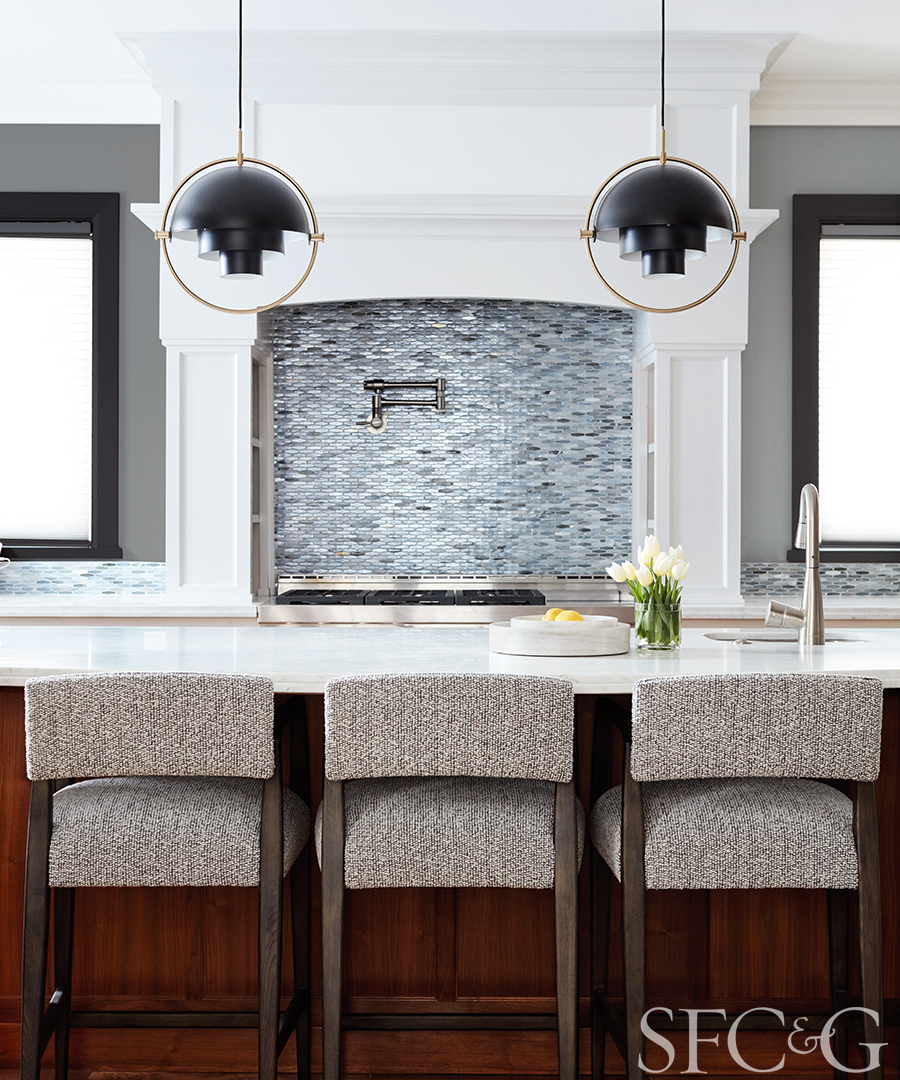 A pair of Luis Weisdorf Multi-Lite pendants illuminates the breakfast nook; barstools from Four Hands wear a Robert Allen fabric. Marble bowls from Plantation.