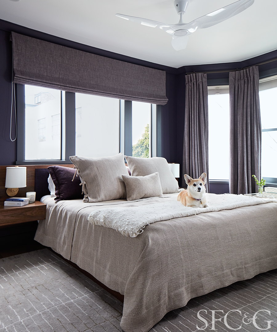 In the master bedroom, sconces from Visual Comfort’s Barbara Barry collection flank a Seventh & 7th Designs custom bed and headboard, which wears a Zimmer + Rohde fabric. Bedding is through Anthem.