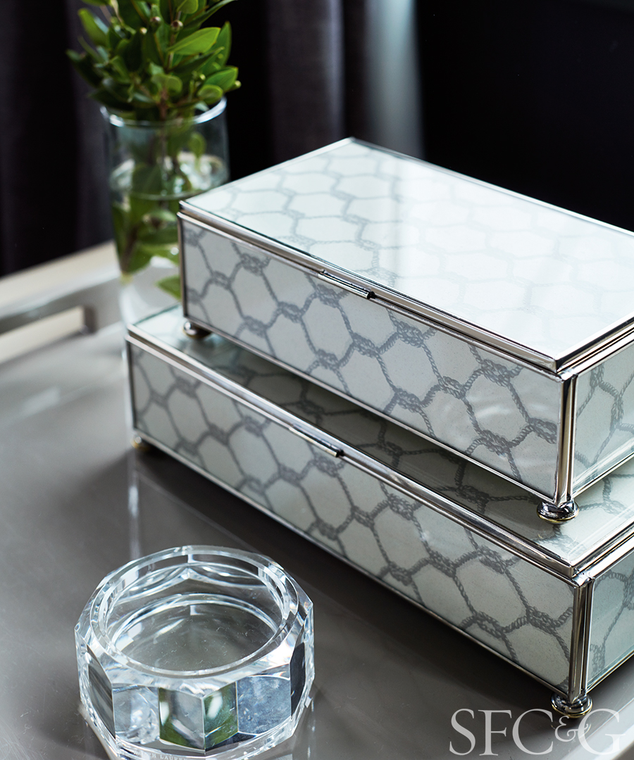 Decorative boxes, tray and crystal dish are through Plantation.