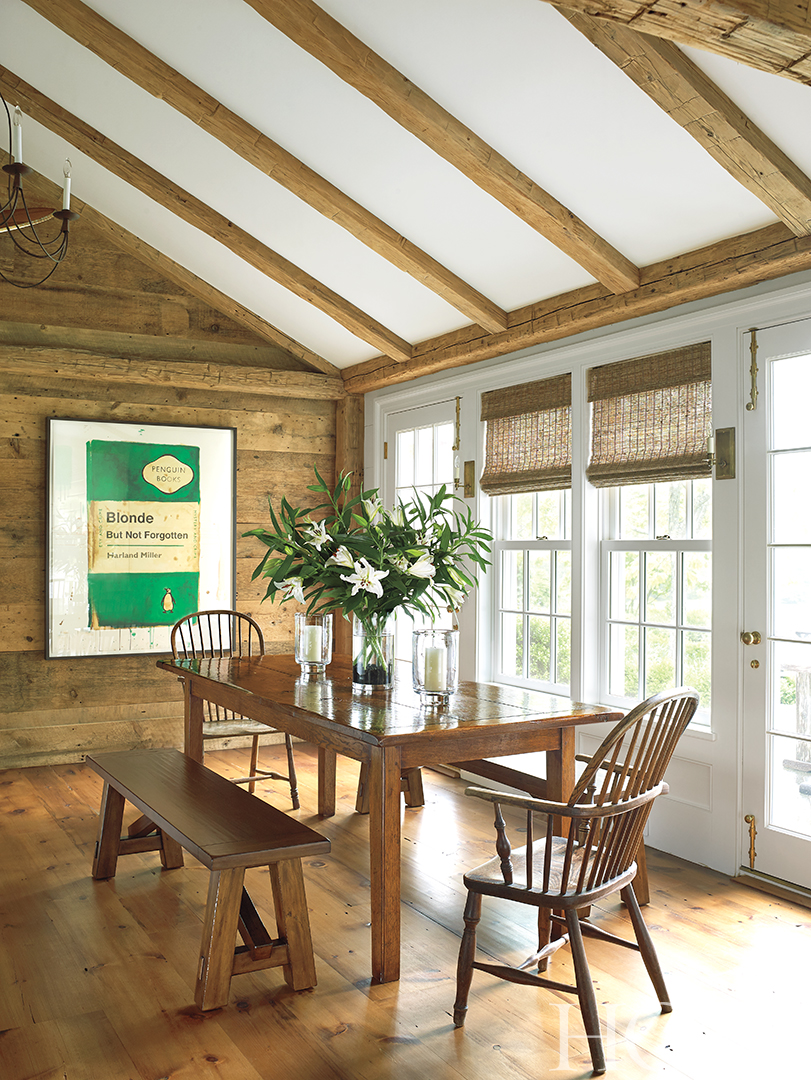 In the kitchen’s breakfast area, Pottery Barn benches and antique Windsor chairs surround a French farm table.