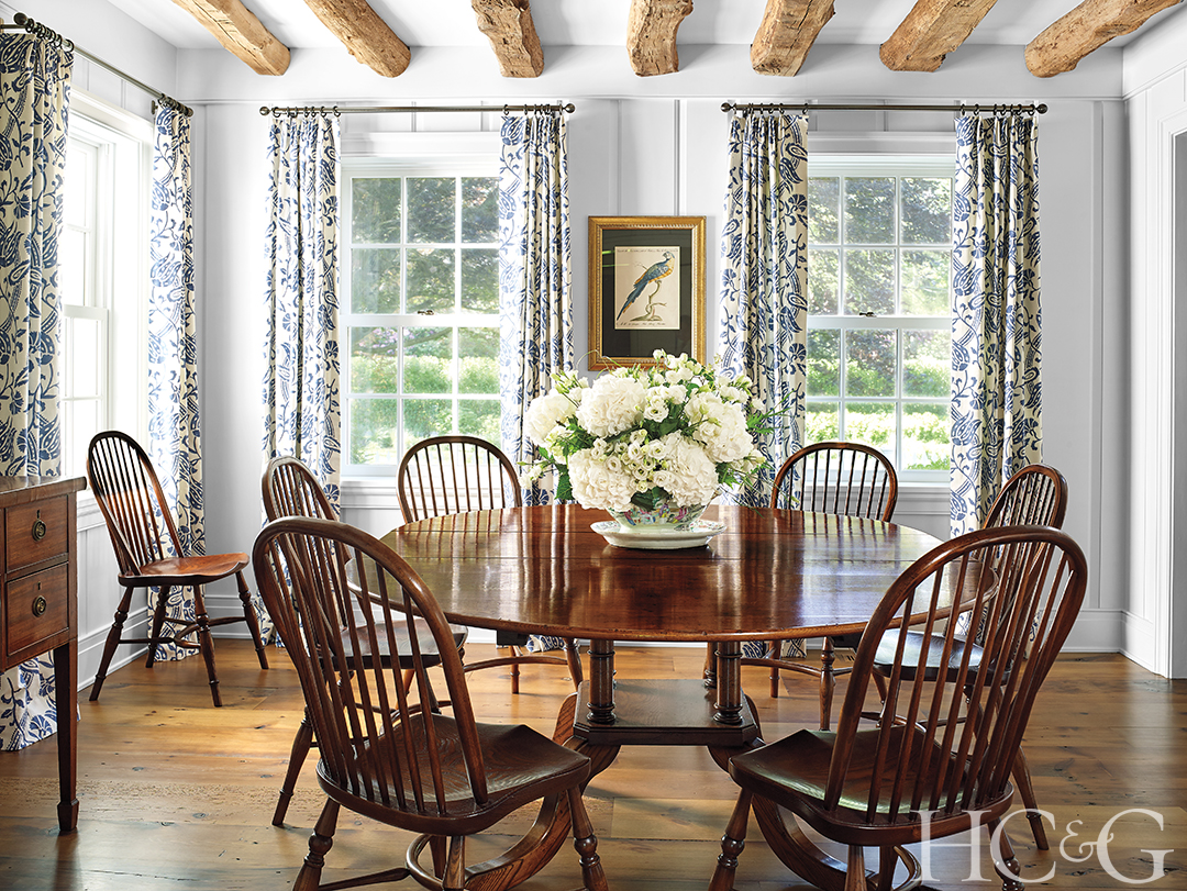 In the dining room, Windsor chairs surround a table from English Country Home; the curtains are made from a Hines & Co. fabric.