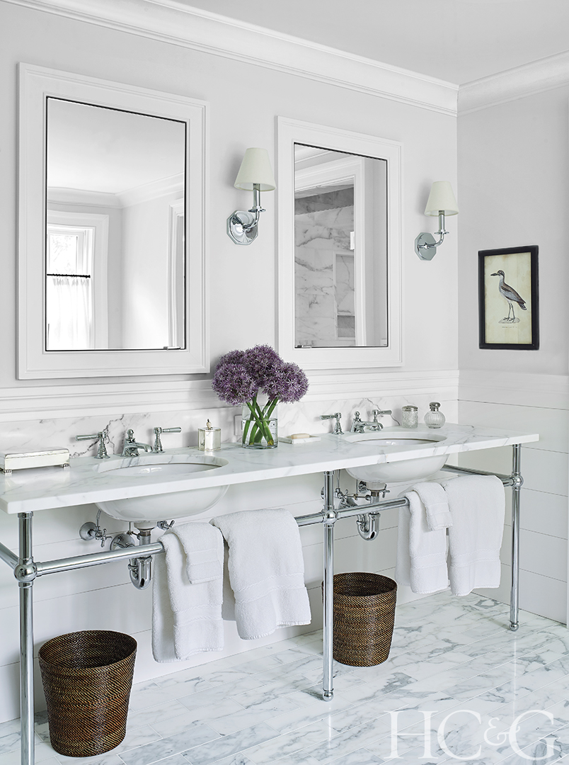 The washstand is from Waterworks and Calacatta Gold marble flooring from Artistic Tile.