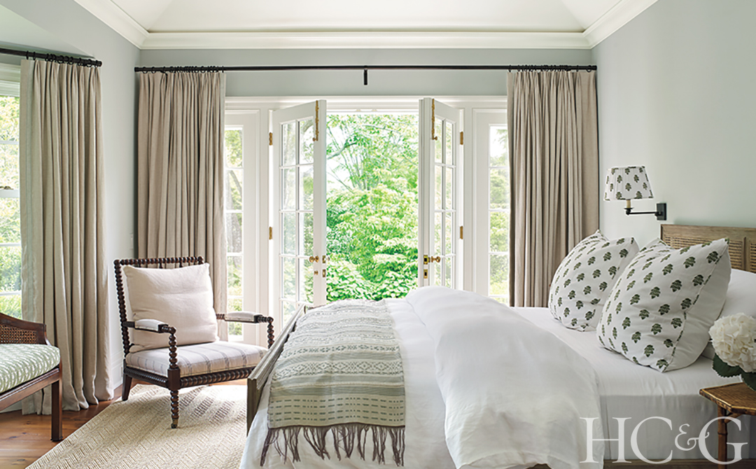 The throw pillows and lampshades in a guest room are fabricated from C&C Milano’s Stampino in Giada.