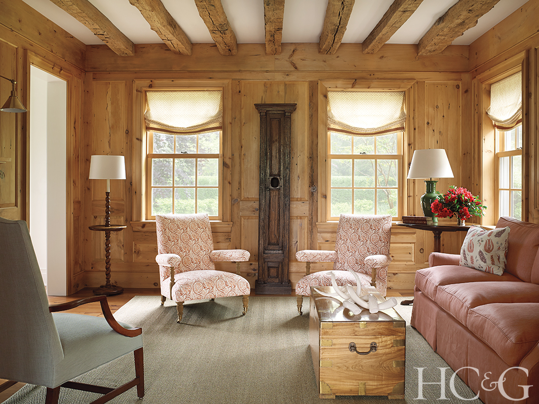 RH armchairs and a Stark carpet anchor the cozy wood-paneled library.
