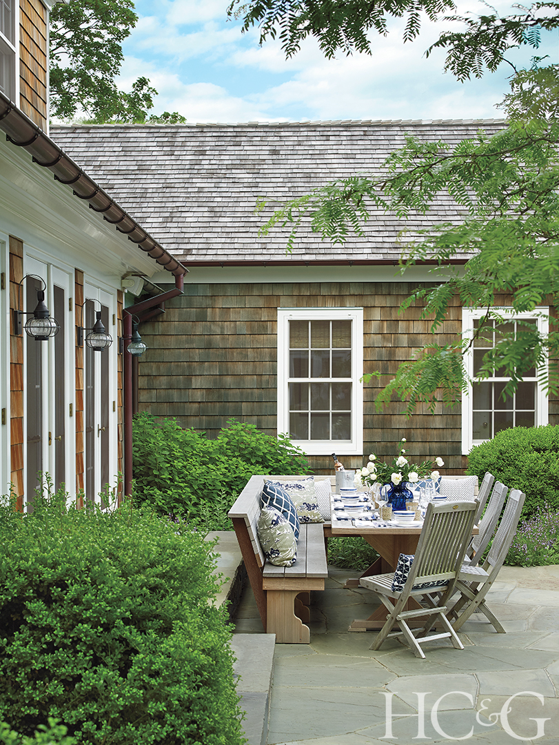 Bluestone pavers lead to the home’s covered porch entryway, where Serena & Lily throw pillows accent a Kingsley Bate teak bench.