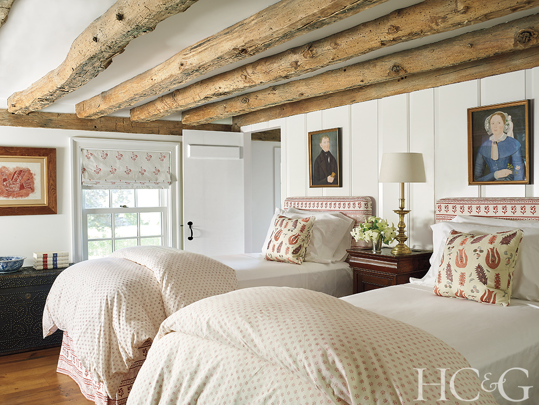 Original rafters line the ceiling of another guest room, where beds are dressed with VLes Indiennes duvets.