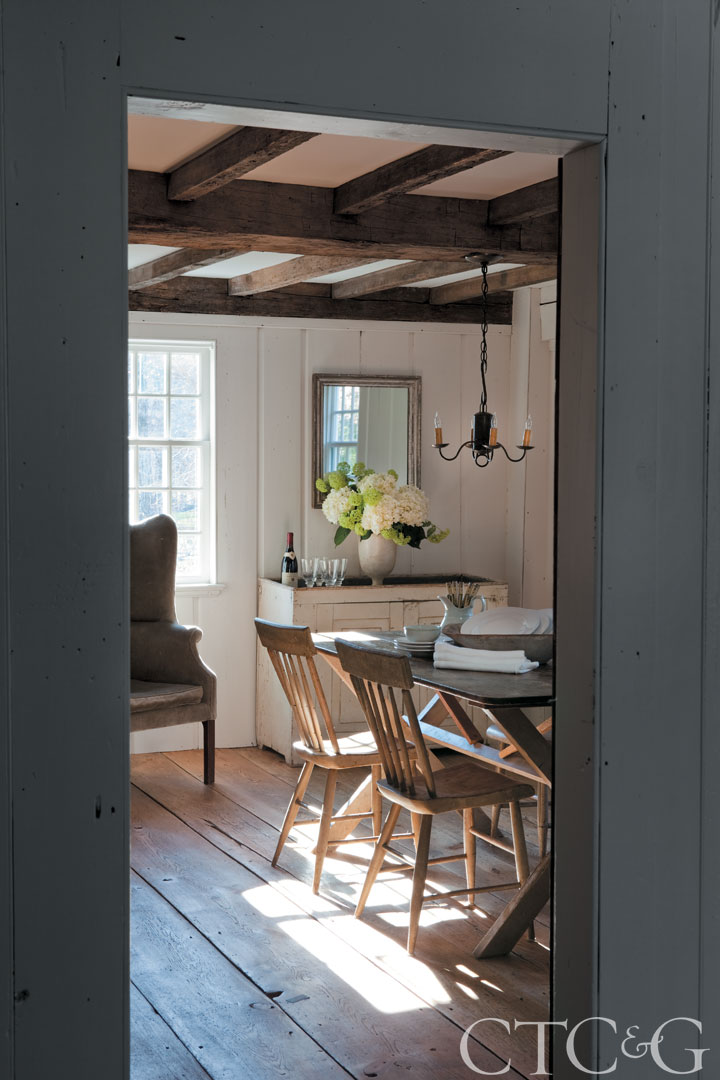 In the dining room, as throughout the rest of the house, Fishelson removed drywall on the ceiling to expose textured antique beams.
