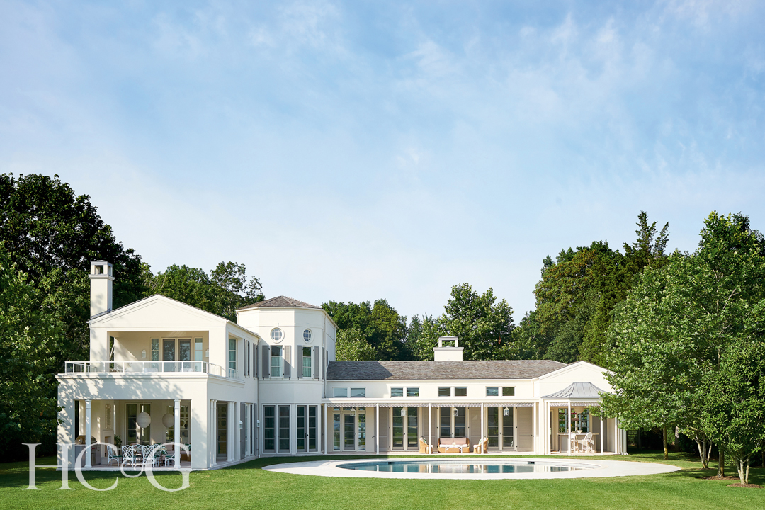 At first Sawyer and Berson thought they might riff on the shiplap-clad captain’s houses that populate nearby Sag Harbor, but the Swids wanted something more like their home in California: a stucco house. (The couple now resides in Florida, coming to the East End for the summer.) “We have always thought that, when done right, stucco houses are spectacular, beautiful homes,” says Kaki. “We knew it would be great in the Hamptons where we are on the water.” Sawyer and Berson were game for the challenge. “They wanted a little bit of a Beverly Hills swagger to it, and it was easy to identify a style that we dubbed ‘Noyack Regency’ later on,” says Sawyer. “We’ve always been fascinated with this sort of Deco take on Regency style,” says Berson. The team looked to 1930s architecture for inspiration, specifically the Coral Casino Beach and Cabana Club in Santa Barbara and the Deco-style Alex Camp House by John Staub in Dallas.