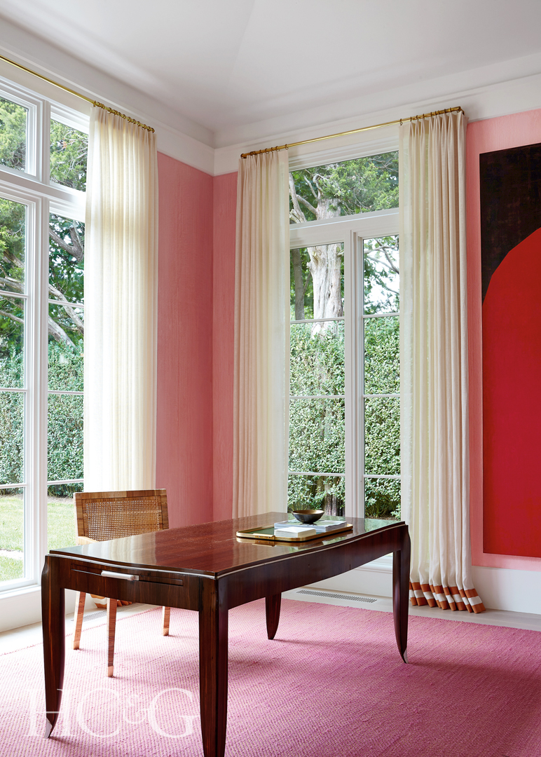 The Swids brought on architect and interior designer Daniel Romualdez to help them furnish their new home, which is threaded with greens and pinks and summery prints. In the primary bathroom, Kaki longed for the instantly recognizable Martinique wallpaper because she and Scott had had their first date at the Beverly Hills Hotel’s Polo Lounge. The wallpaper and a slew of tropical-themed textiles, including Wayne Pate for Studio Four NYC fabric on the breakfast room chairs and Peter Dunham’s “Fig Leaf ” for outdoor pillows, are right at home in a house Sawyer described as being “all about summertime living.”