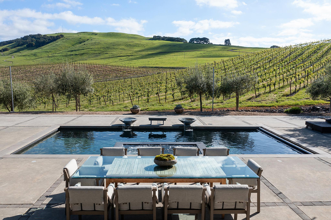 With a pool and spa, an outdoor fireplace, and a bocce ball court all nestled within 150 acres of vineyards, the property feels like a world of its own. It’s also just 45 minutes away from the Golden Gate Bridge, so it’s easy to get into the hustle of San Francisco.