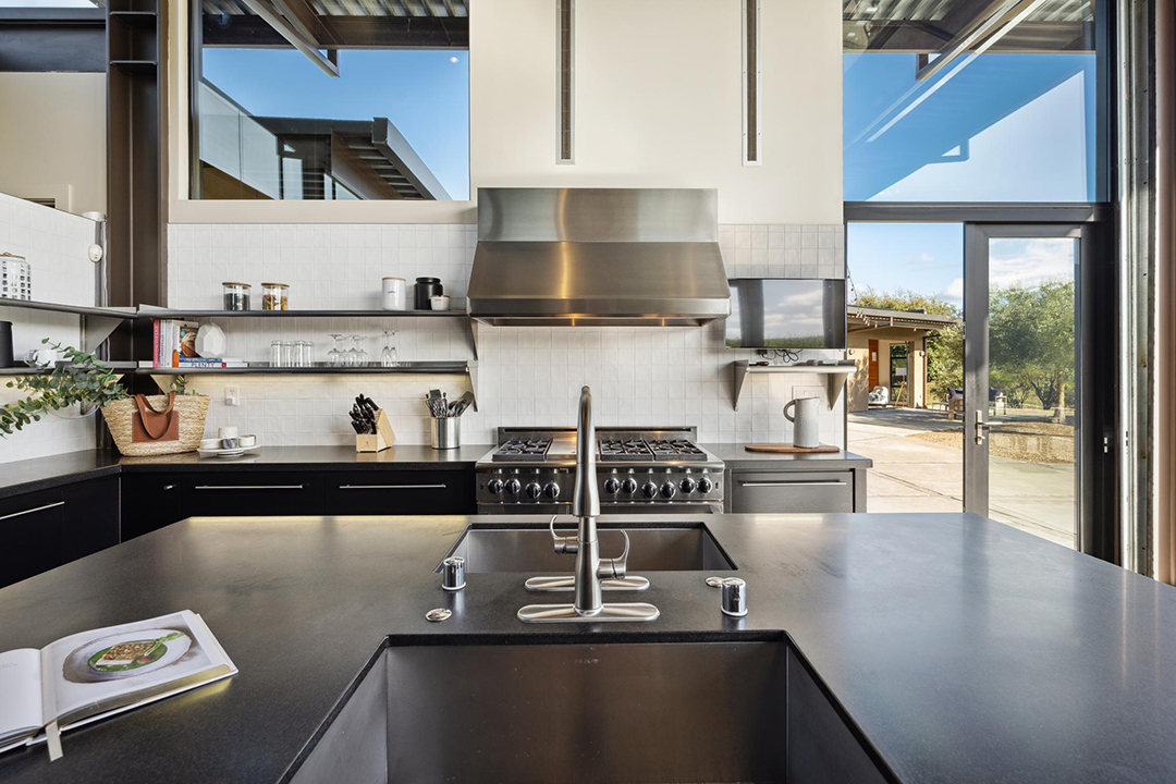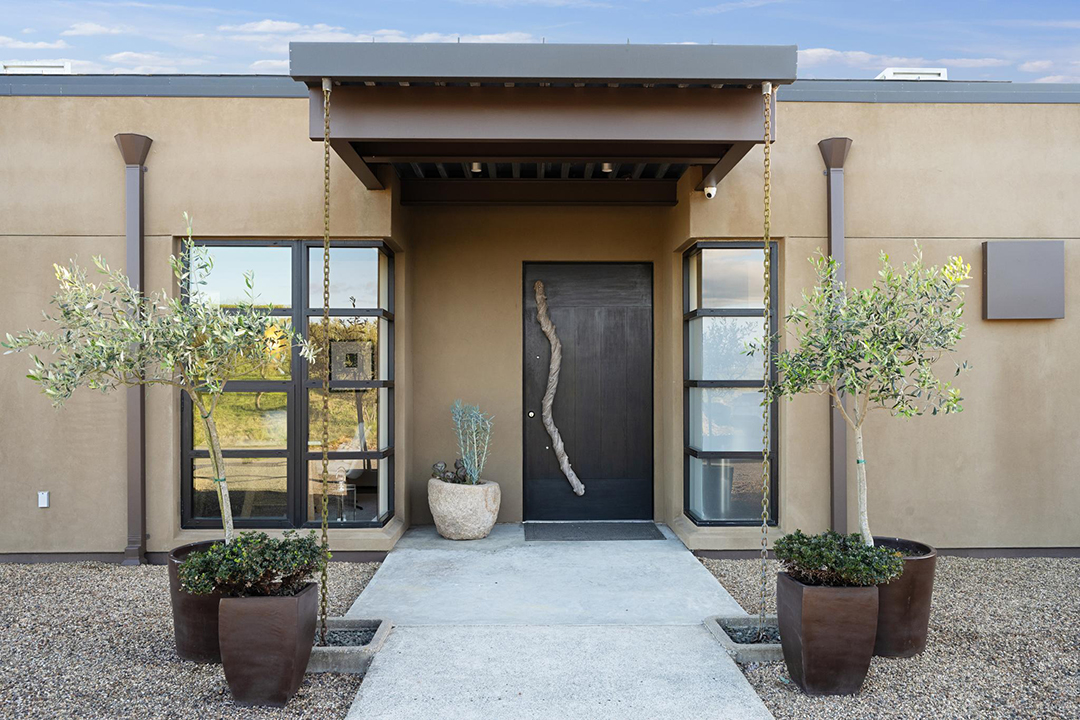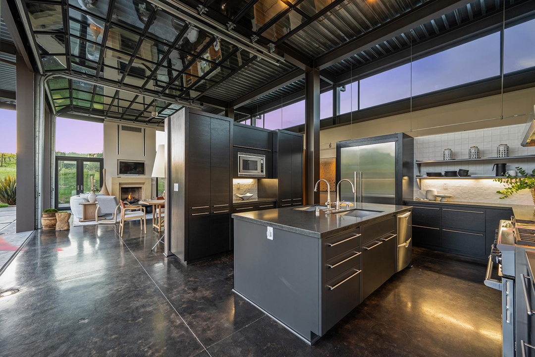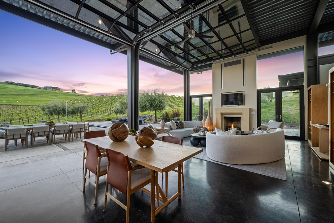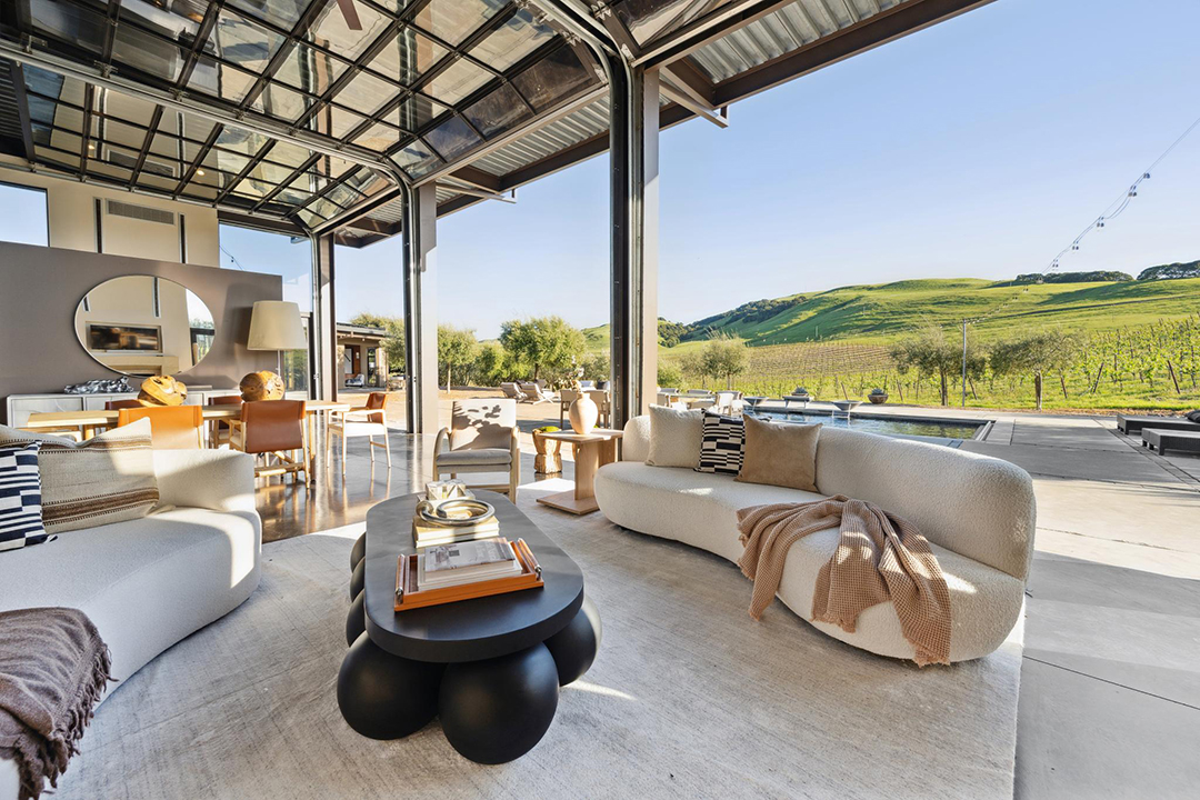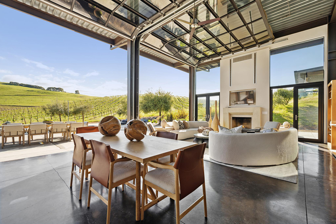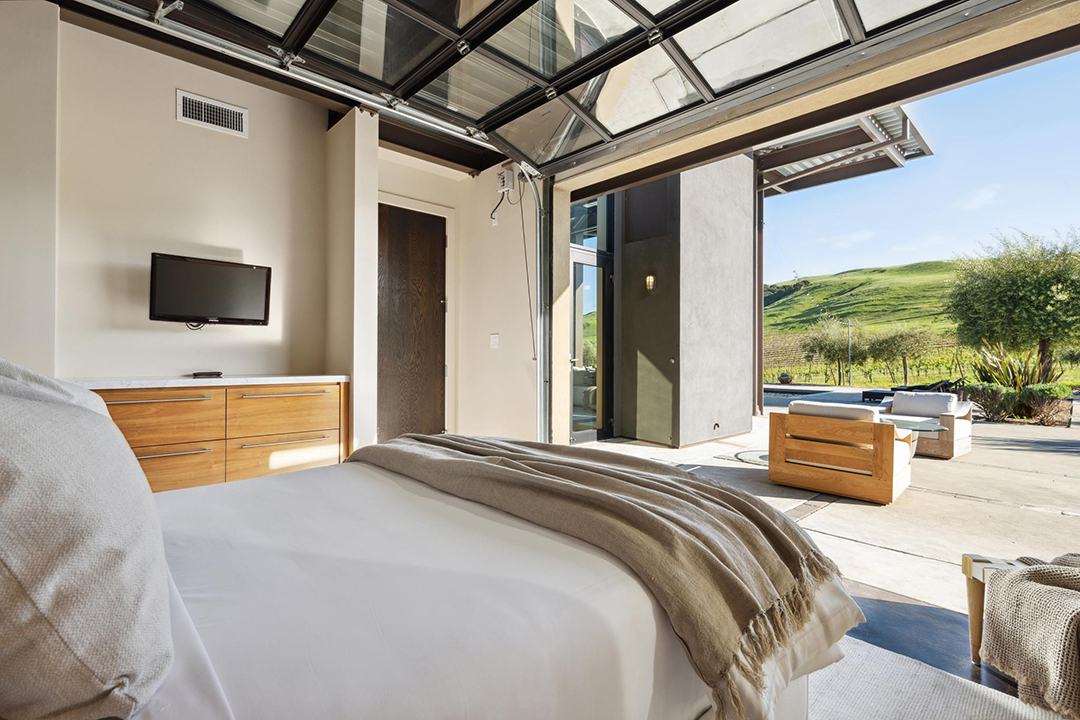 The 3,350-square-foot residence named “The Glass House” features retractable glass walls that redefine true indoor-outdoor living, allowing the vineyards to seemingly roll throughout the home. In fact, as the name would suggest, almost all the rooms feature large swaths of glass in some form or another. When lifted open, the Sonoma air lightens any room, taking advantage of the almost year-round cool air.