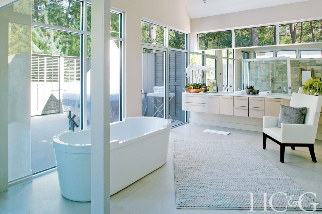 The vanity in the ample master bath is lacquer and stone. A Barbuda chair upholstered in faux leather and a Duravit tub flank a woven wool rug.