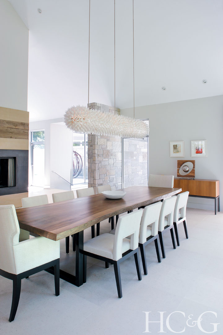 A light fixture by Helen Gifford hangs above a raw-edged walnut table in the high-ceilinged dining room.