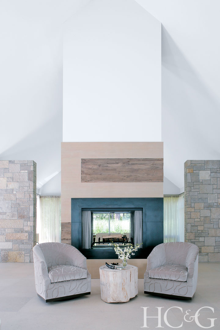 The living room fireplace is accented with reclaimed wood; the hand-hewn walnut table is flanked by custom-upholstered swivel chairs.