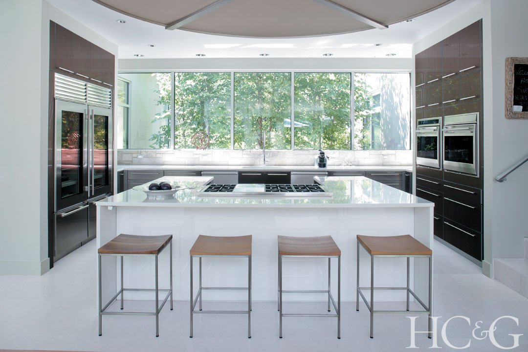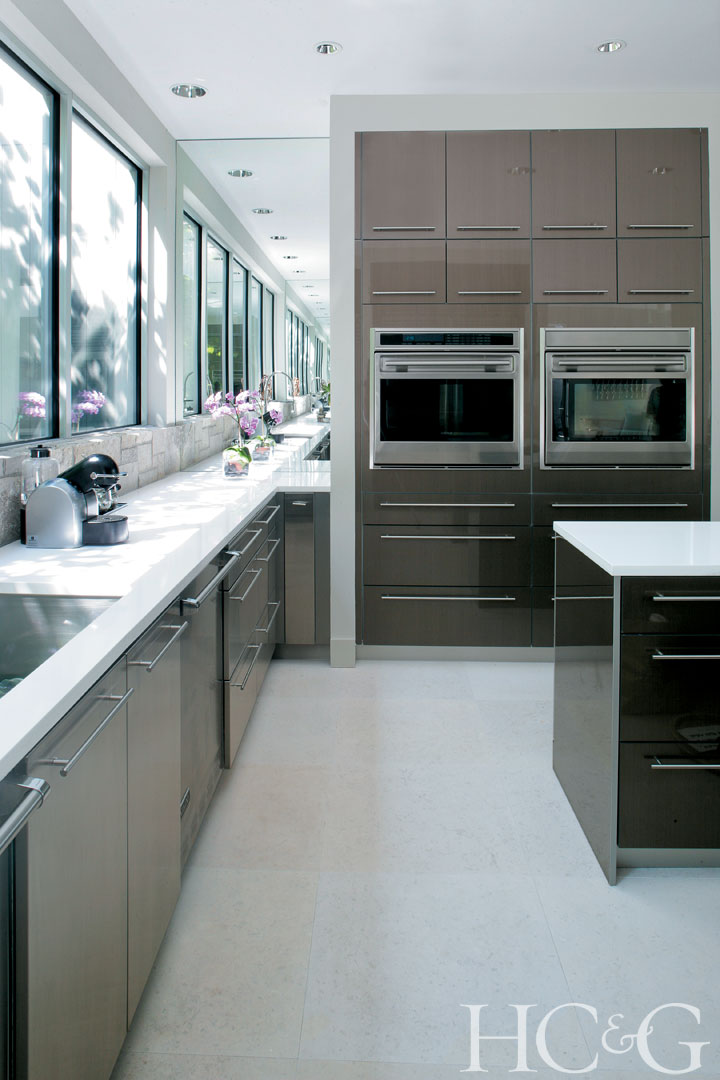 Extra shimmer appears in the high-gloss cabinetry and stainless-steel accents in the Wolf wall ovens, Viking dishwashers and Sub-Zero refrigerators.