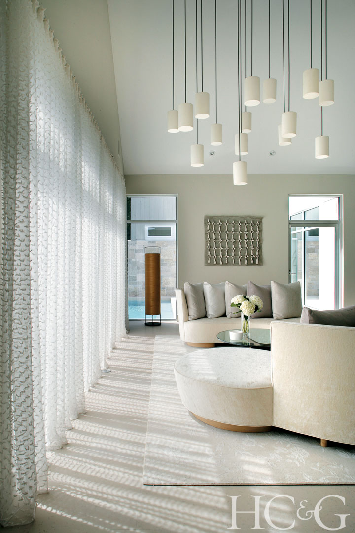 Soraida Bedoya’s porcelain-on-linen Bed Hooks hangs in the living room, which receives filtered light through open-weave drapes by Larsen. The rice-paper ceiling fixture is by John Wigmore.