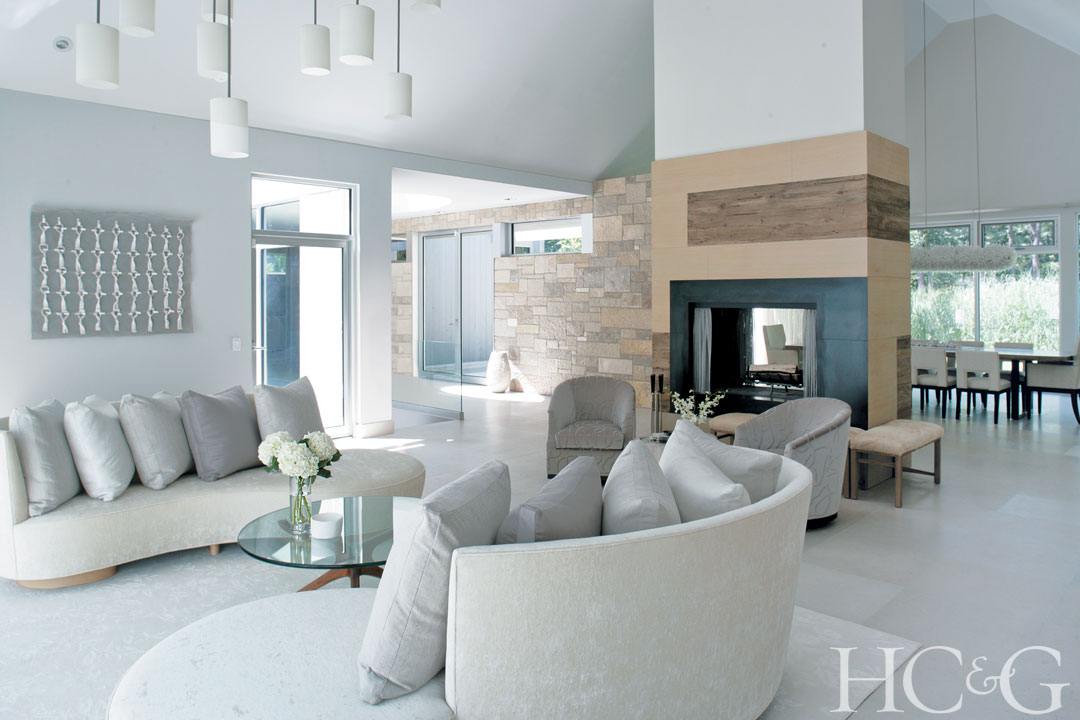 Sensuous furnishings offset the formal living room’s strict lines. Curves are seen throughout, from the pair of Vladimir Kagan sofas to the mid-20th-century cocktail table. The tone-on-tone silk rug is from Odegard.