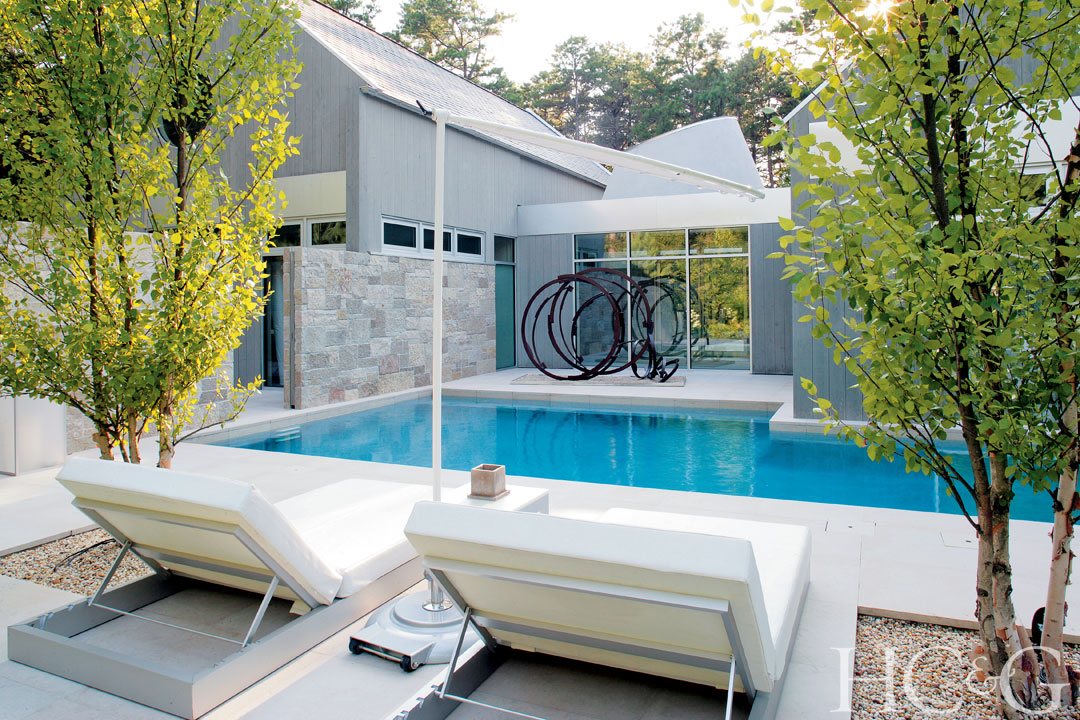 Alongside a breezeway, Joel Perlman’s Seven Ponds II anchors the courtyard side of the swimming pool, across from a pair of Royal Botania chaise longues.