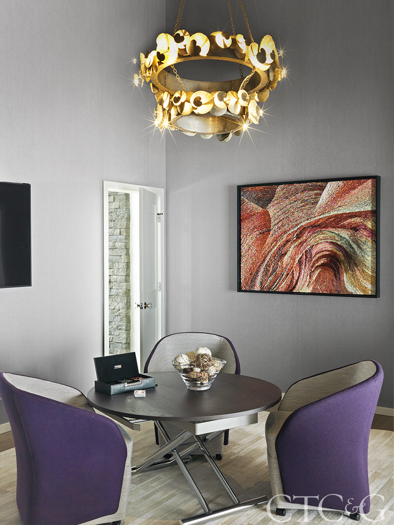In the study, a poker table from Milano Smart Living is adjustable in height and size. Purple Bernhardt chairs and an Ochre chandelier are a reminder of the room’s luxurious decadence.
