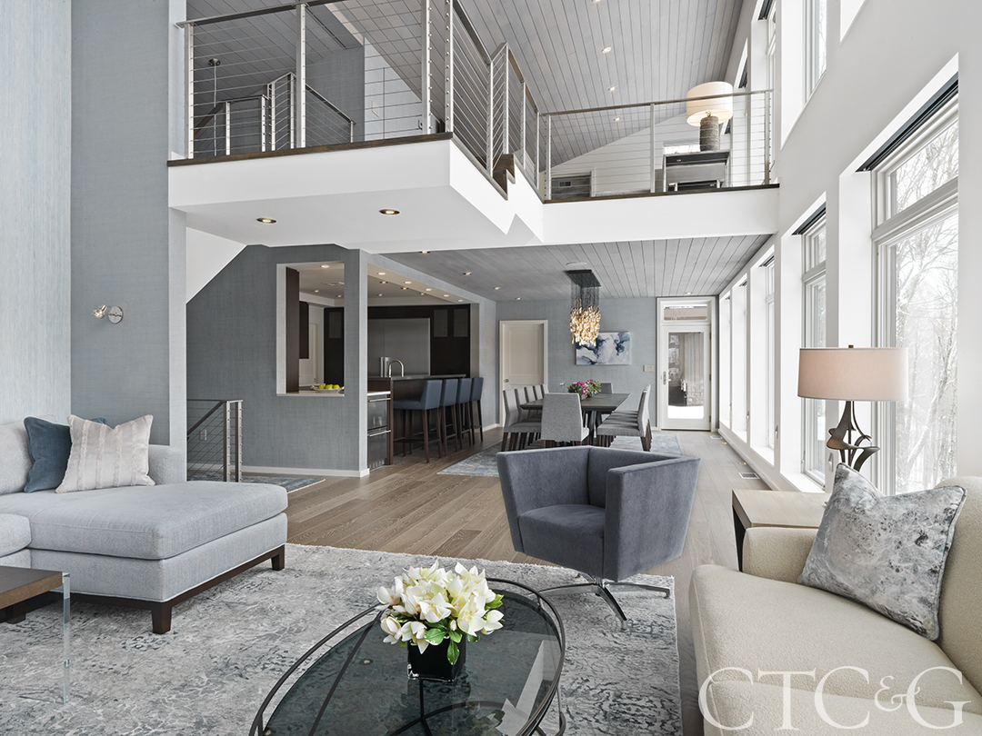 A view of the mezzanine loft shows the architectural delineations that provide at once a sense of open living and clear programmatic separations.