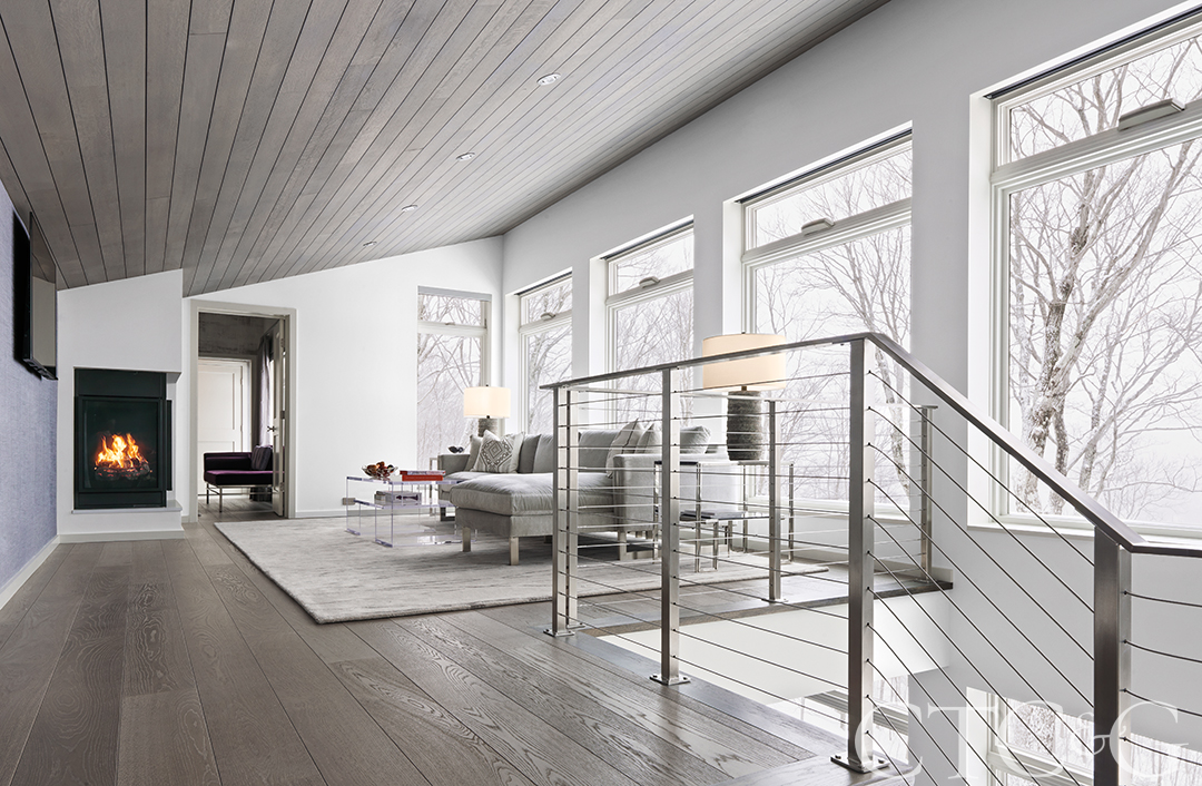 In the living room, David Edward chairs provide a hit of rich color while American Leather sofas complement the often snowy outdoors with an ice-inspired subtle shade. Table lamps are from Vermont’s Hubbardton Forge; coffee table is through Bolier.