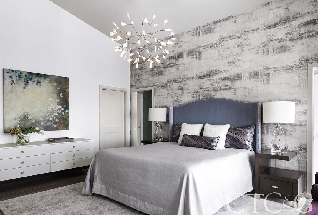 A Jan Rosol dresser provides an almost-neutral furnishing for this richly textured master bedroom; the Romo wallpaper brings the outside in with its variegated surface, while lamps from Visual Comfort continue the icy snow theme.