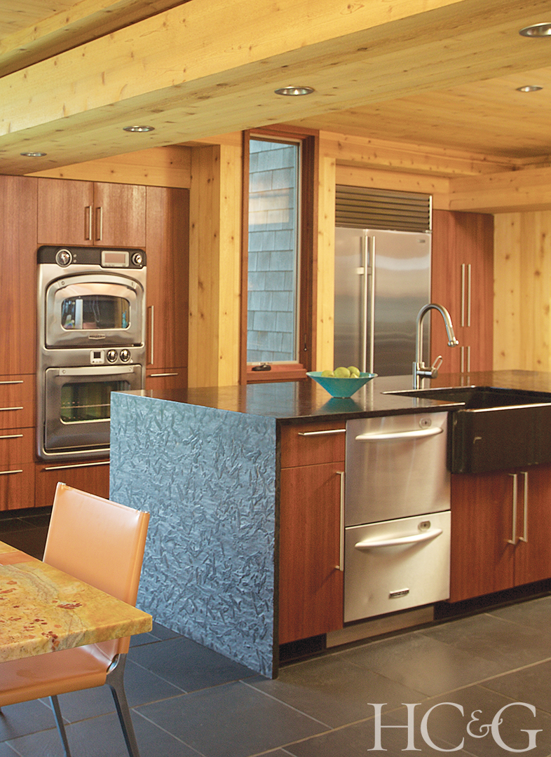 The entry, which is sheathed in rough-sawn red cedar, features a custom zebrawood and wenge bench and slate floor tiles.