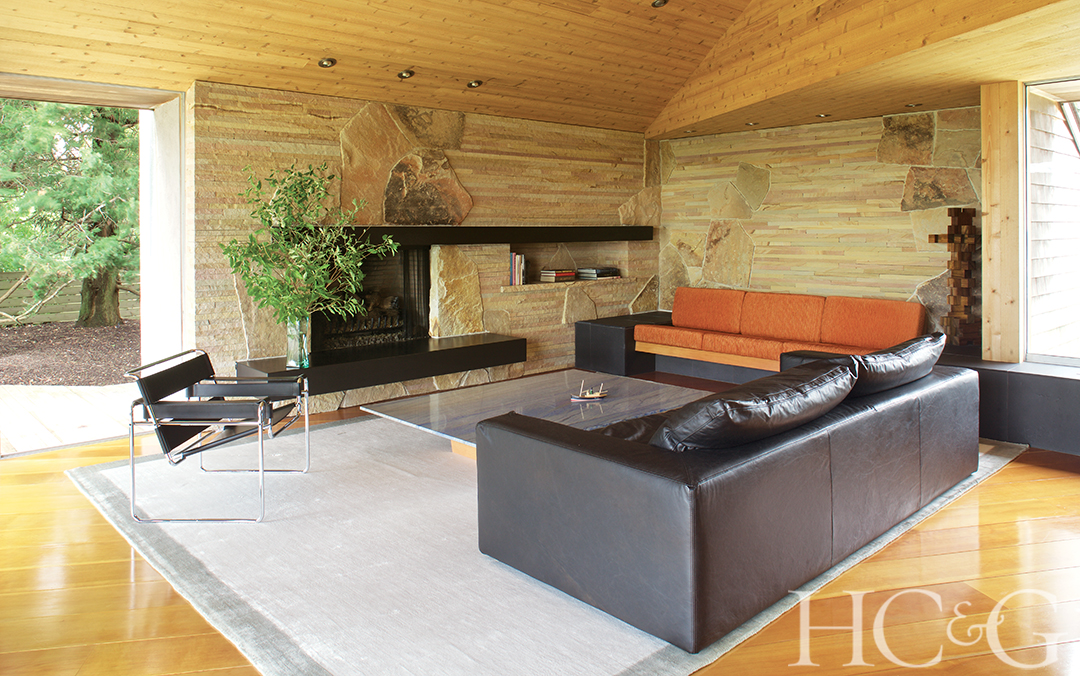 The living room is furnished with a leather RH sofa and area rug and a Marcel Breuer Wassily chair. A toy boat floats on a Miles Jaffe–designed quartzite cocktail table, meant to represent the ocean; Jaffe also designed the two-tone sofa.