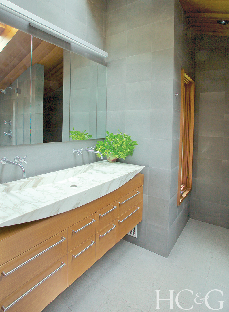 The teak vanity in the master bath is topped with Carrara marble; the faucets are from Kohler.