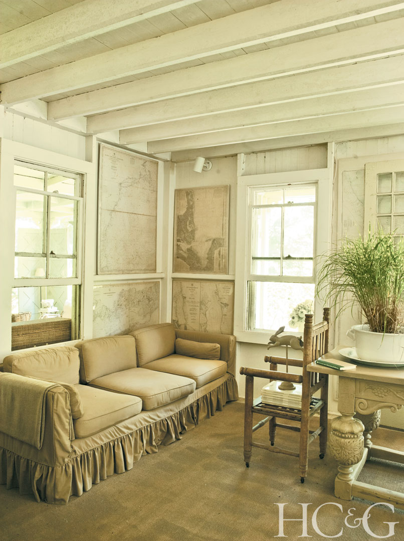 Local sea charts hang on the walls of the back porch.
