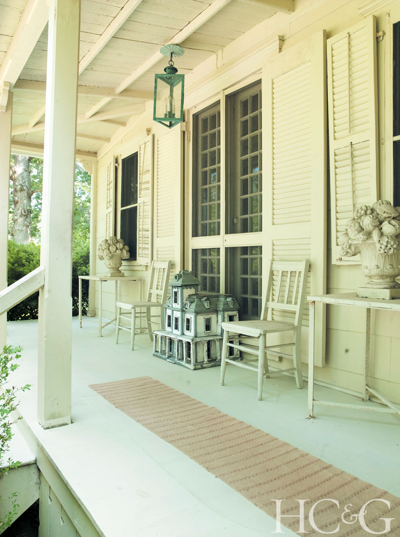 An antique birdhouse in the form of a Victorian mansion stands at the foot of the home’s original front door.