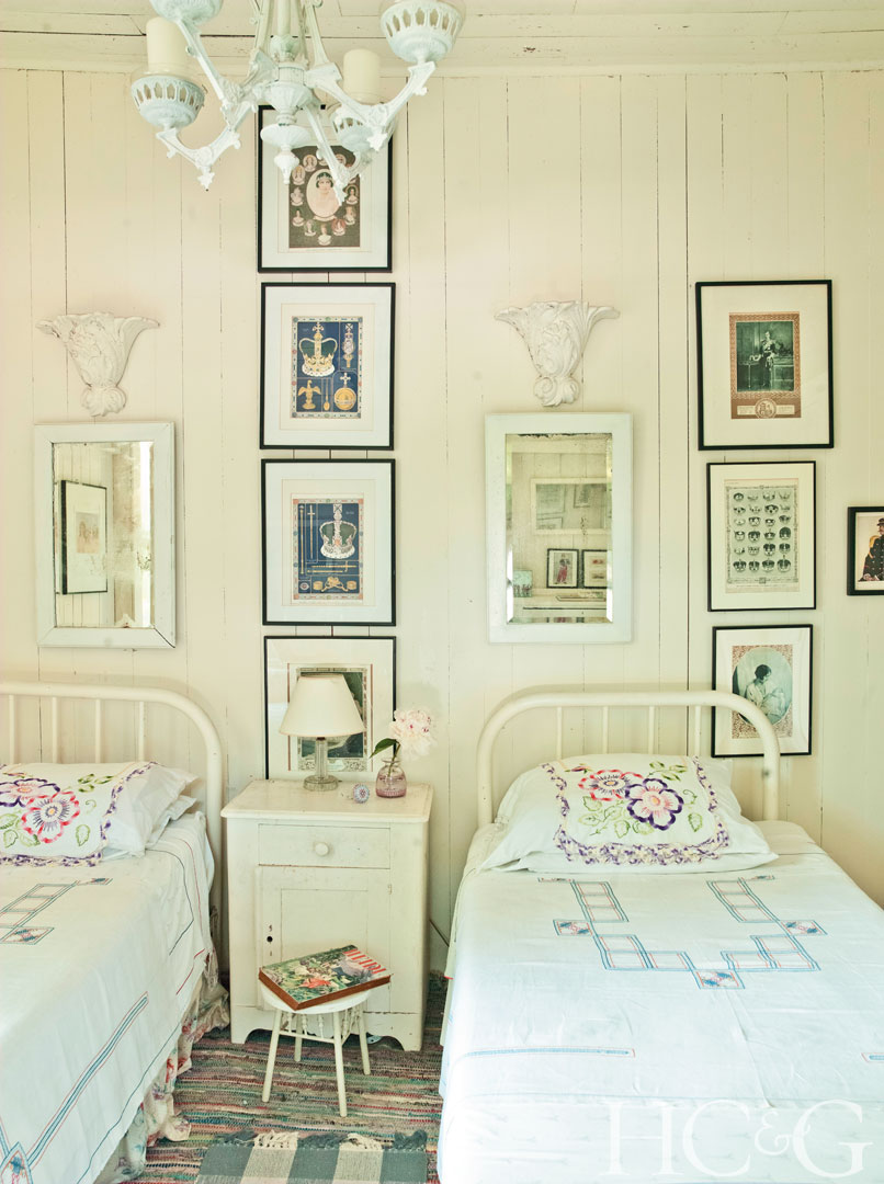 Needlework and vintage chandeliers characterize a guest room with twin beds.