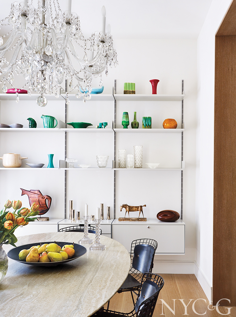 The architect reimagined the L-shaped kitchen as a longer pass-through, connecting the living and dining rooms, and widened the adjoining hallway to allow for a more gracious entry. He also brought more natural light into both ends of the home by reconfiguring the windows—a feat that required permission from both the Landmarks Preservation Commission and the building’s co-op board. In the dining area, which faces the street, Pierce restored the window openings to their originally intended height and installed new triple-hung windows. And off the living area, a pair of glass doors was replaced by a modern steel-and-glass wall of windows and a door leading to the terrace. “We kept the private and public areas separate throughout,” comments Pierce, “because the clear definition between them makes the residence appear larger than it actually is.”