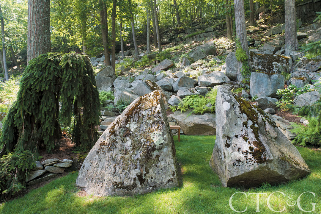 Rather than leave jagged rocks near the front door, they serve as a natural seat, cushioned in grass.