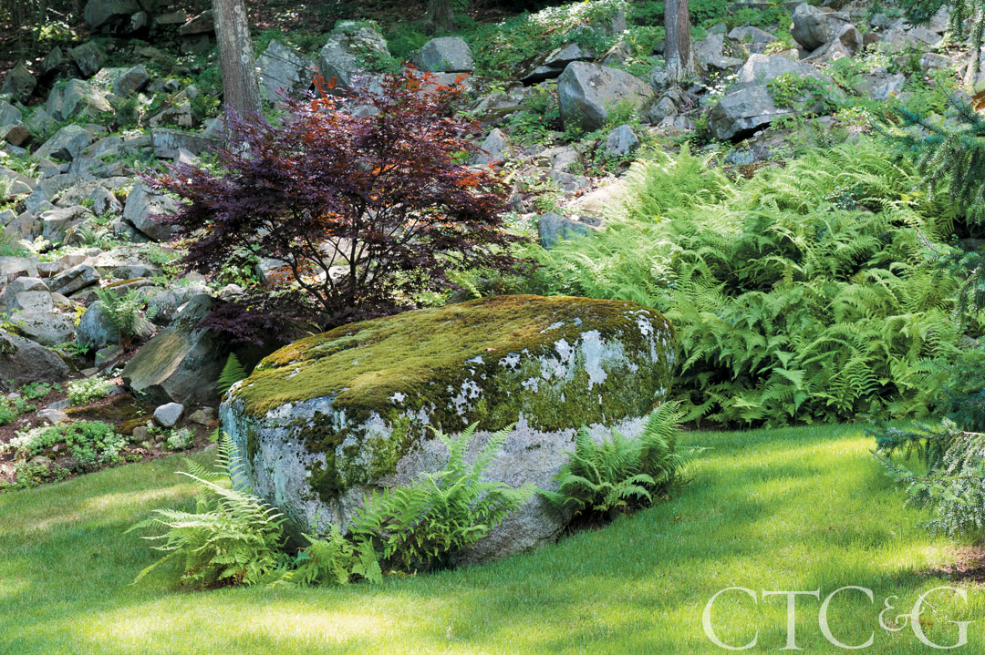 This rock was left in place, grass and ferns planted around it.