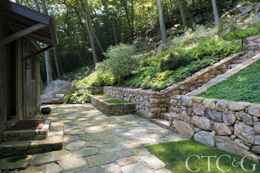 In keeping with the prevailing motif, stone accomplishes all the grade changes.
