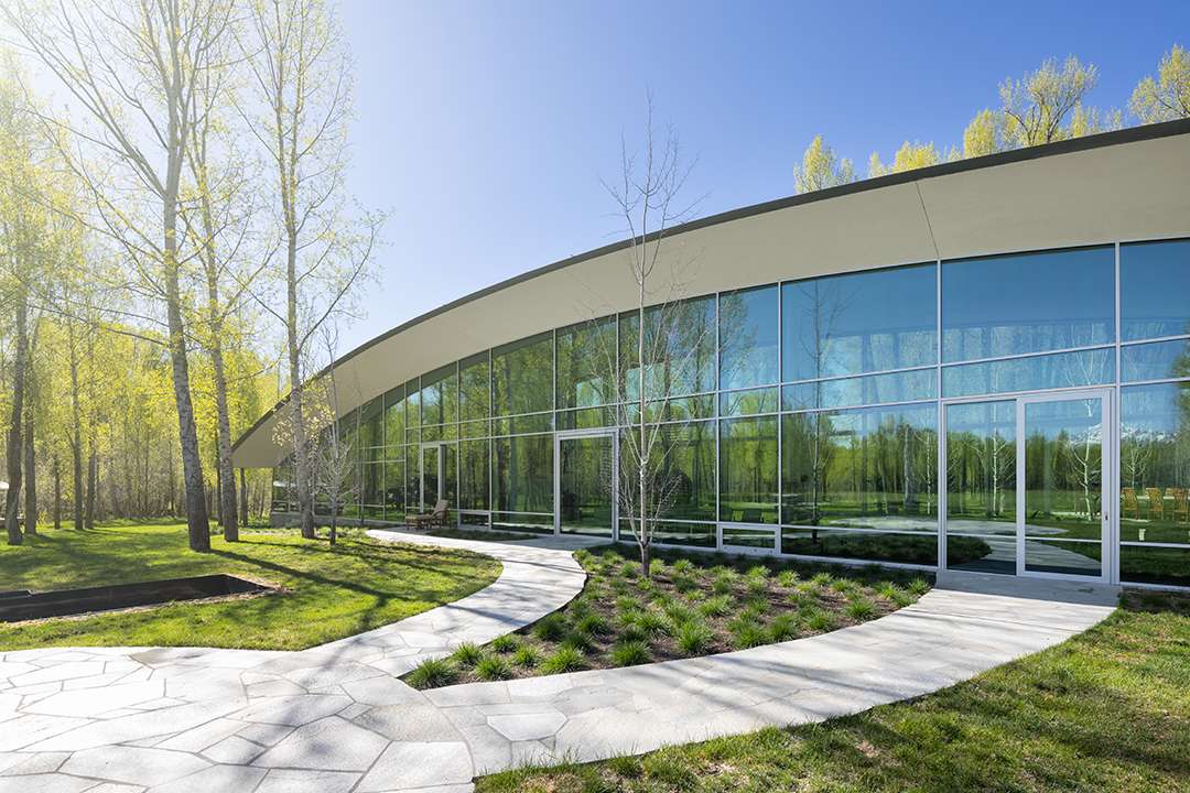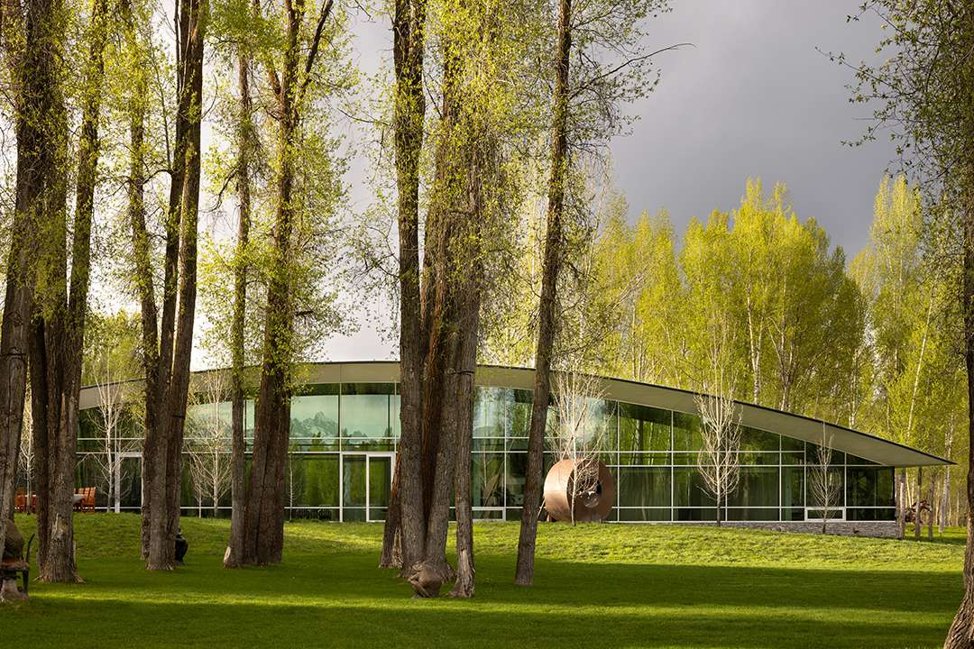 Floor-to-ceiling concave windows show off incredible views of the Tetons, while allowing for an abundance of natural light to pour in during the day. At night, real sculptures light up the property outside. The parabolic shapes are presented in the metal roof, but also in the kitchen’s island.