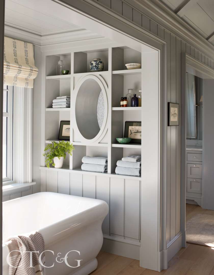 Well-considered details like cozy nooks, window seats, bull’s-eye windows and even a Jeffersonian alcove bed recall the grandeur of historic summer beach cottages. “Collectively, we wanted this house to look as though it had been around for over a hundred years,” says Dixon. “We used classic, early 1900s shingle houses as inspiration.”