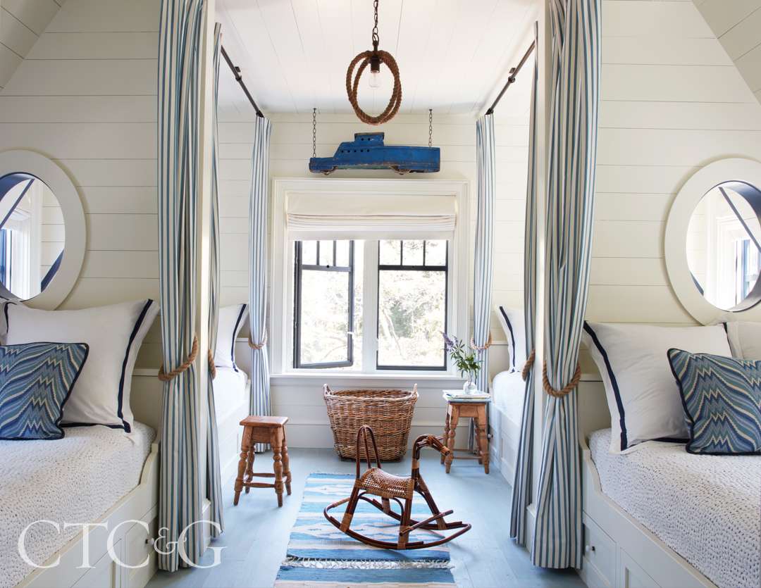 A grand staircase sweeps up to the bedrooms, where a primary suite with soothing water views is painted in Farrow & Ball’s Light Blue 22 and furnished with a mix of antiques and custom pieces. A series of guest bedrooms includes a bunk room, accessed via an interior walkway, that has four beds built into the gables, each with privacy curtains and porthole windows. “We wanted the bunk room to evoke the feeling of sleeping aboard a ship—cozy, playful and a little adventurous,” says Connor. “Building the beds into the gables gave each child a sense of their own little berth, while the privacy curtains added a layer of whimsy and function. The nautical touches, like the rope tiebacks and striped textiles, helped bring that vision to life in a way that feels both imaginative and intentional.”