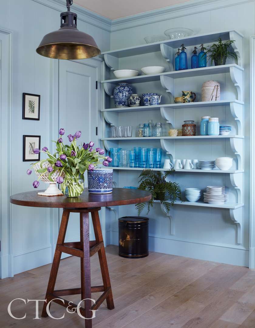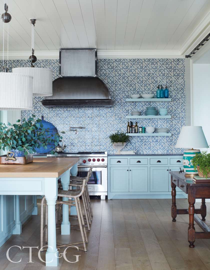 Coastal hues fill the kitchen, where a wall of Waterworks decorative field tile complements blue cabinetry and a custom stainless-steel hood, the homeowner’s collection of aqua pottery fills shelves in the butler’s pantry, and Soane Britain pendants above the island offer a soft, sculptural presence. “We loved how their woven, basket-like shape brought artisanal detail to the space,” says Connor. “The rise-and-fall feature adds both charm and functionality, allowing the lighting to adapt to different tasks and moods throughout the day.”