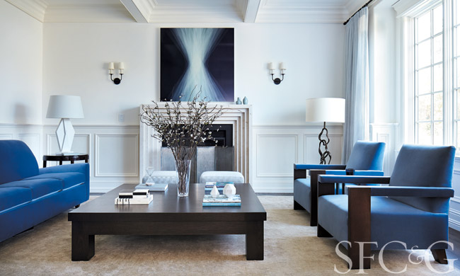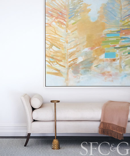 Living room chairs and a sofa upholstered in Holland & Sherry velvets flank a Holly Hunt cocktail table from Kneedler | Fauchère. Bronze and steel side tables by Tuell & Reynolds are through De Sousa Hughes. Pagani bronze floor lamp is through Baker Knapp & Tubbs. Bernadette Jiyong Frank’s Spaces in Between is through Dolby Chadwick Gallery. Rug is through Mark Nelson Designs.