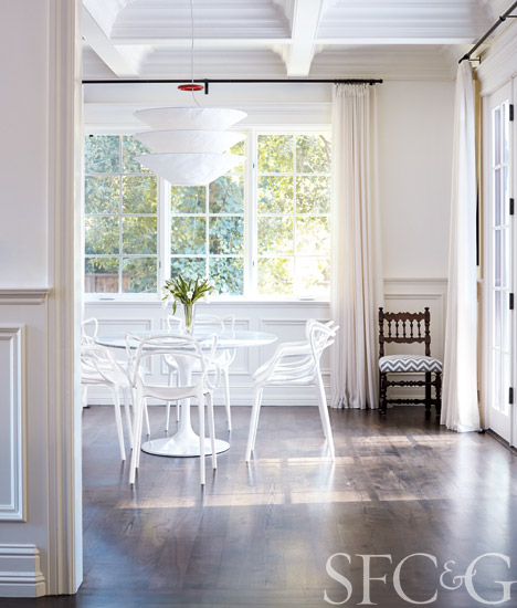An Ingo Maurer paper-shade pendant makes a statement above an Eero Saarinen Tulip table and Philippe Stark chairs in the breakfast room.