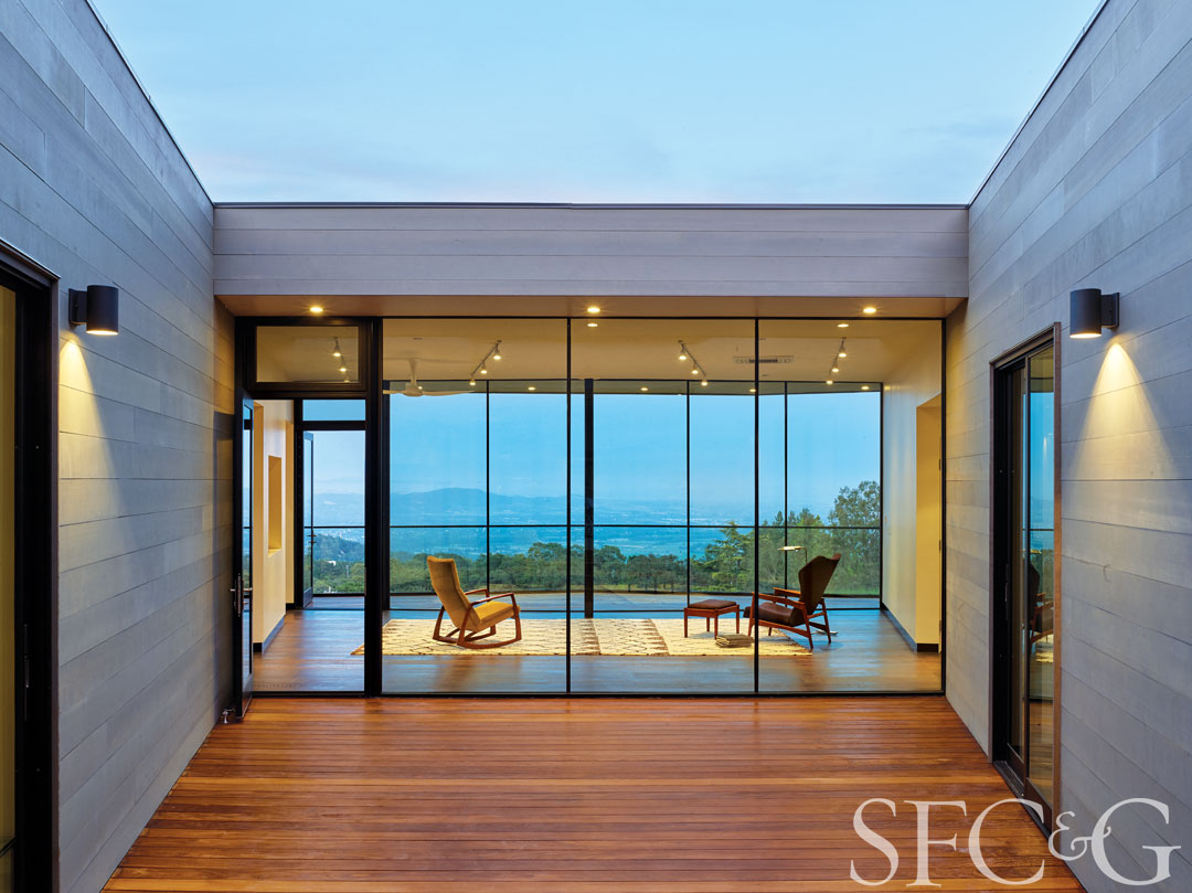 Fixed-glass window walls allow for views from the courtyard through the living room to the rolling hillside beyond. Rocker is from Mid Century Mobler; rug is from Tony Kitz Gallery. Chair and ottoman are from Mid-Century Modern Finds.