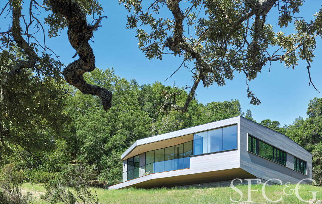 Architect Neal Schwartz designed the home to marry with the site; the structure cantilevers out and capitalizes on the views. Cladding is cedar finished with a gray stain.