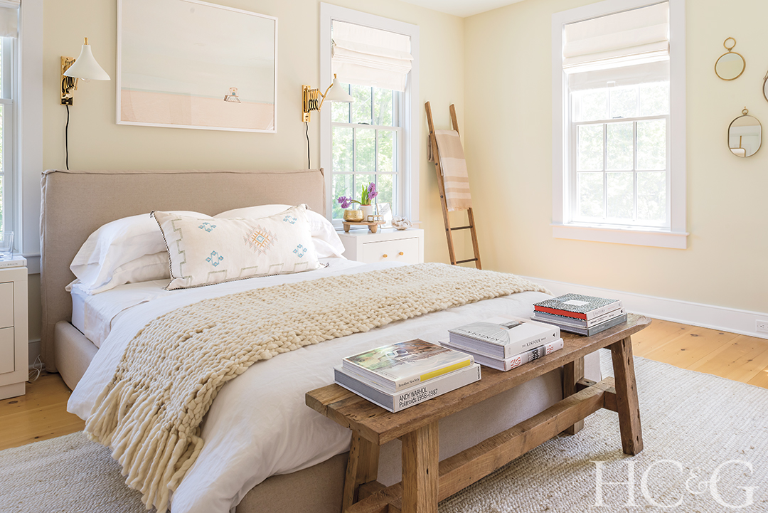 The master suite contains an RH bed, a bench from Terrain, a photograph from One Kings Lane, and sconces from Rejuvenation.
