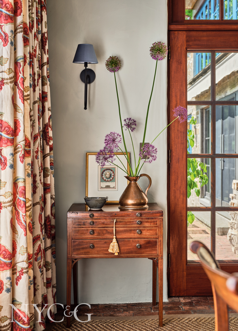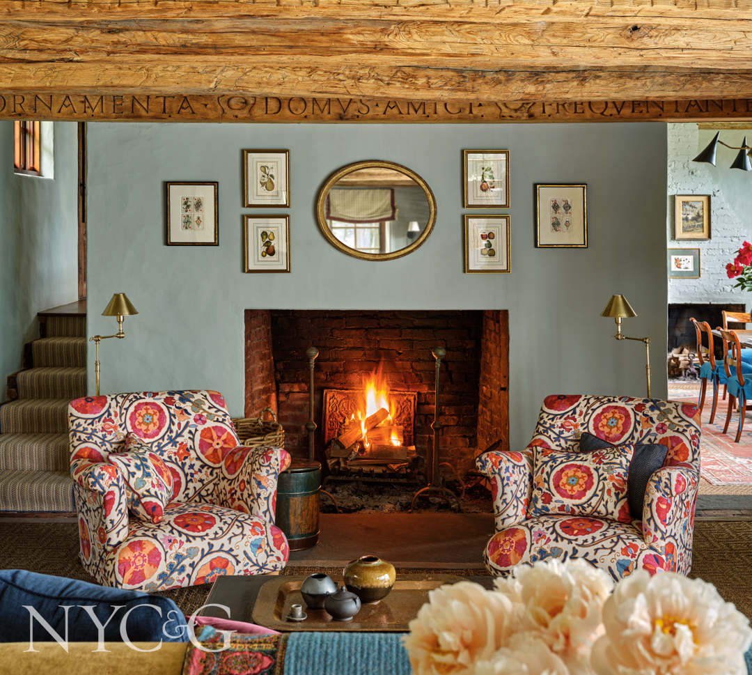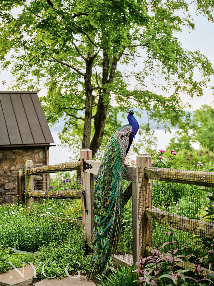 There was always an extra pair of eyes in sight as work progressed outside and inside of this house in Snedens Landing. The dwelling was already part of a fairy tale–like enclave of century-old houses, each distinctive and quirky in shape and style, situated high above the Hudson River on the rocky Palisades. But whenever interior designer John Ferguson arrived to measure rooms, or when the restoration architect Nate McBride was there to assess his new floor plan, or when the homeowner drove the half hour north from her law firm in lower Manhattan to the house, that other set of eyes belonging to a resident peacock was there to greet them.