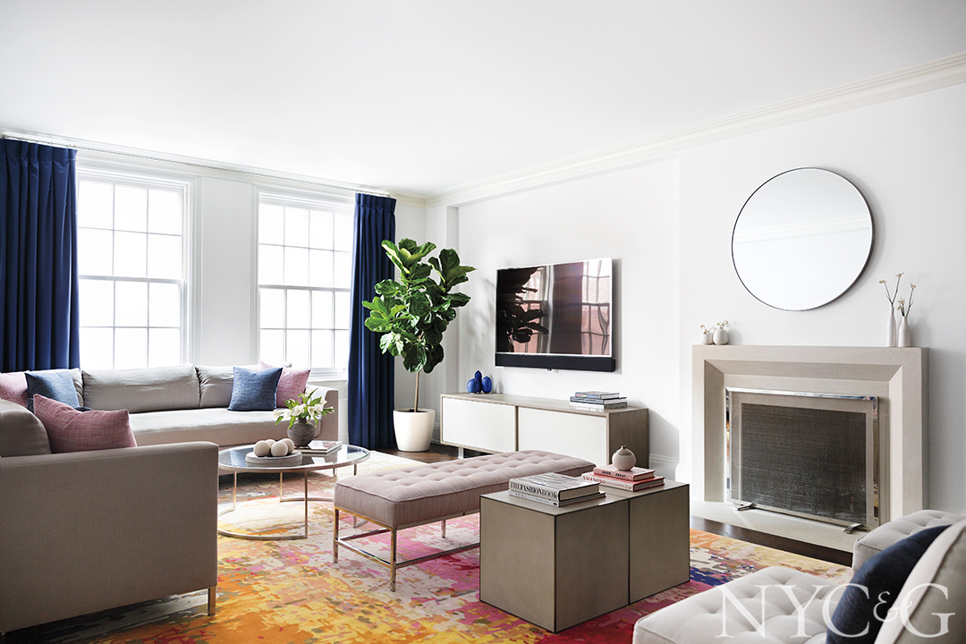 While the revised floor plan was taking shape, Lichten was in constant contact with interior designer Anne Chessin, with whom he had worked previously. “We know each other well enough that we have our own shorthand,” he says. “The process had to go fast, so communication was firing on all cylinders.” Chessin, who had been involved in the early planning stages of the Morrises’ Upper West Side renovation before the family decided to sell, “already had a good sense of their style and tastes,” she recalls, and “they were up for taking risks. The traditional undertones are still there, but in order to keep things from seeming stuffy, we layered in bright colors and clean, contemporary furnishings and lighting that make the place young and fun.” The jumping-off point for the living room, for example, was a vibrant Stark rug that Sarah Morris had spotted in a former project of Chessin’s. “I wanted someone to help bring out our aesthetic, and I knew Anne wouldn’t push us into something that wasn’t us,” Sarah says. “We needed a place where we could be comfortable with our kids.”